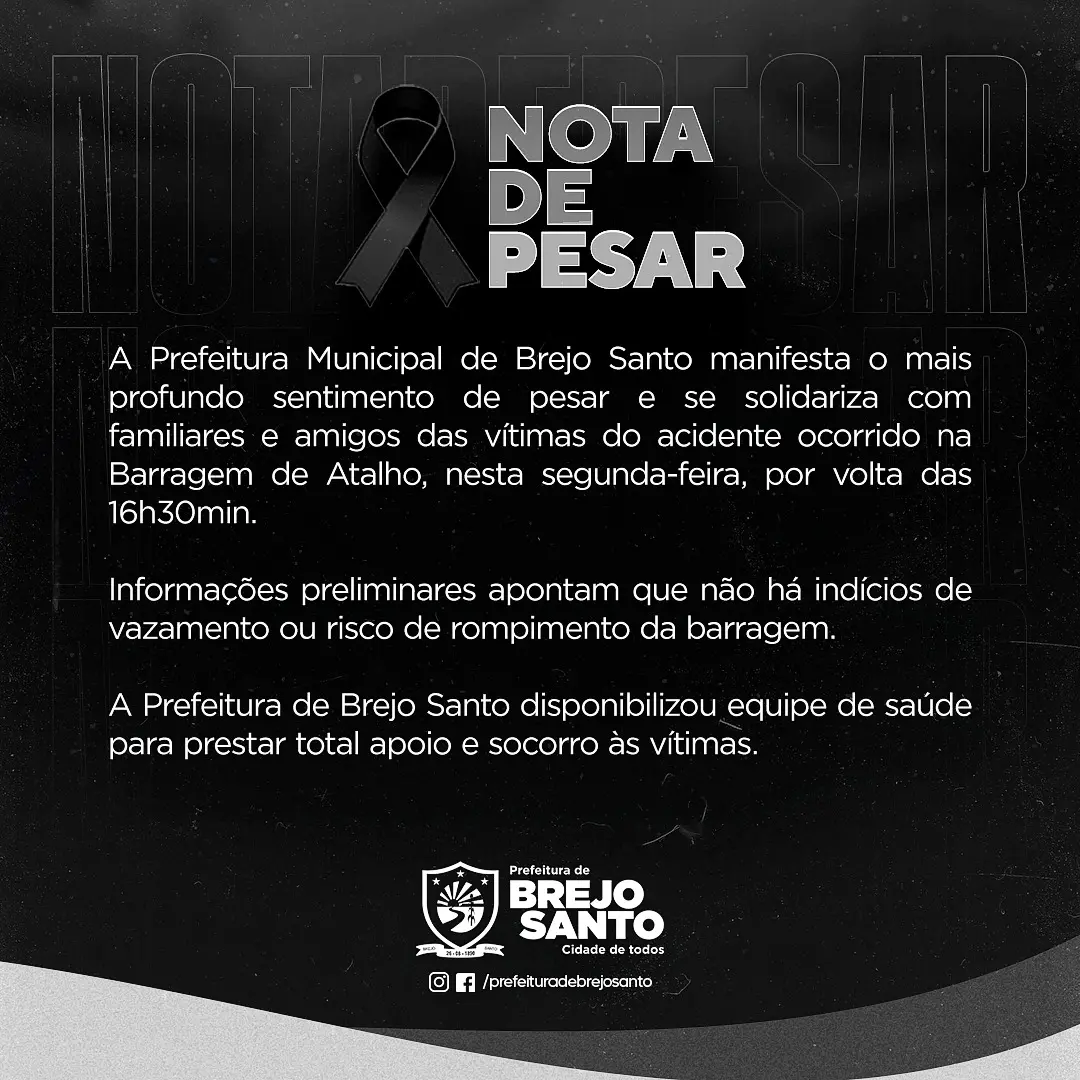 Na noite desta segunda-feira (8), a Prefeitura Municipal de Brejo Santo informou que "manifesta o mais profundo sentimento de pesar e se solidariza com familiares e amigos das vítimas do acidente na Barragem do Atalho" e que "disponibilizou equipe de saúde para prestar total apoio e socorro às vítimas".