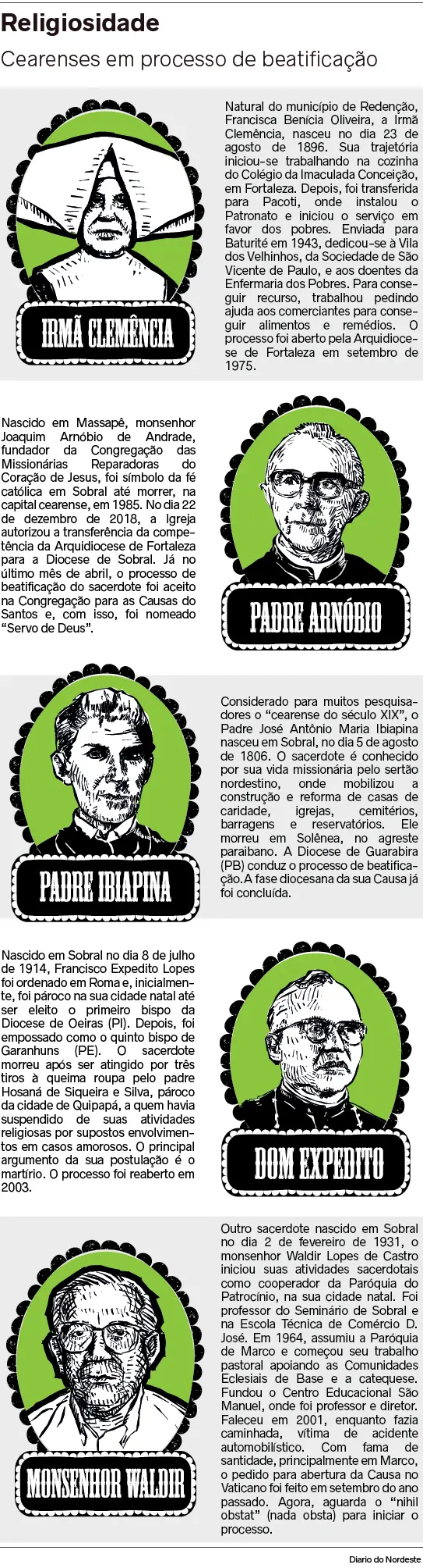 Outros quatro cearenses já conseguiram o 'Nihil obstat', mas nenhum obteve resultado positivo até agora. "Os processos são sigilosos. Pode ser até que um milagre esteja sendo estudado, mas não é divulgado", explica Luís. A causa de Francisca Benícia Oliveira, a Irmã Clemência, natural de Redenção, é o mais antigo, aberto pela Arquidiocese de Fortaleza, em setembro de 1975. "Um exemplo de santidade. Há inúmeros relatos. Por exemplo, um senhor que levou uma facada e ficou, como dizia antigamente, com os 'fatos' de fora. Ela, sem nenhum equipamento adequado, colocou tudo para dentro, costurou e ele ficou bom. Um verdadeiro milagre", narra o advogado Luís Lira.