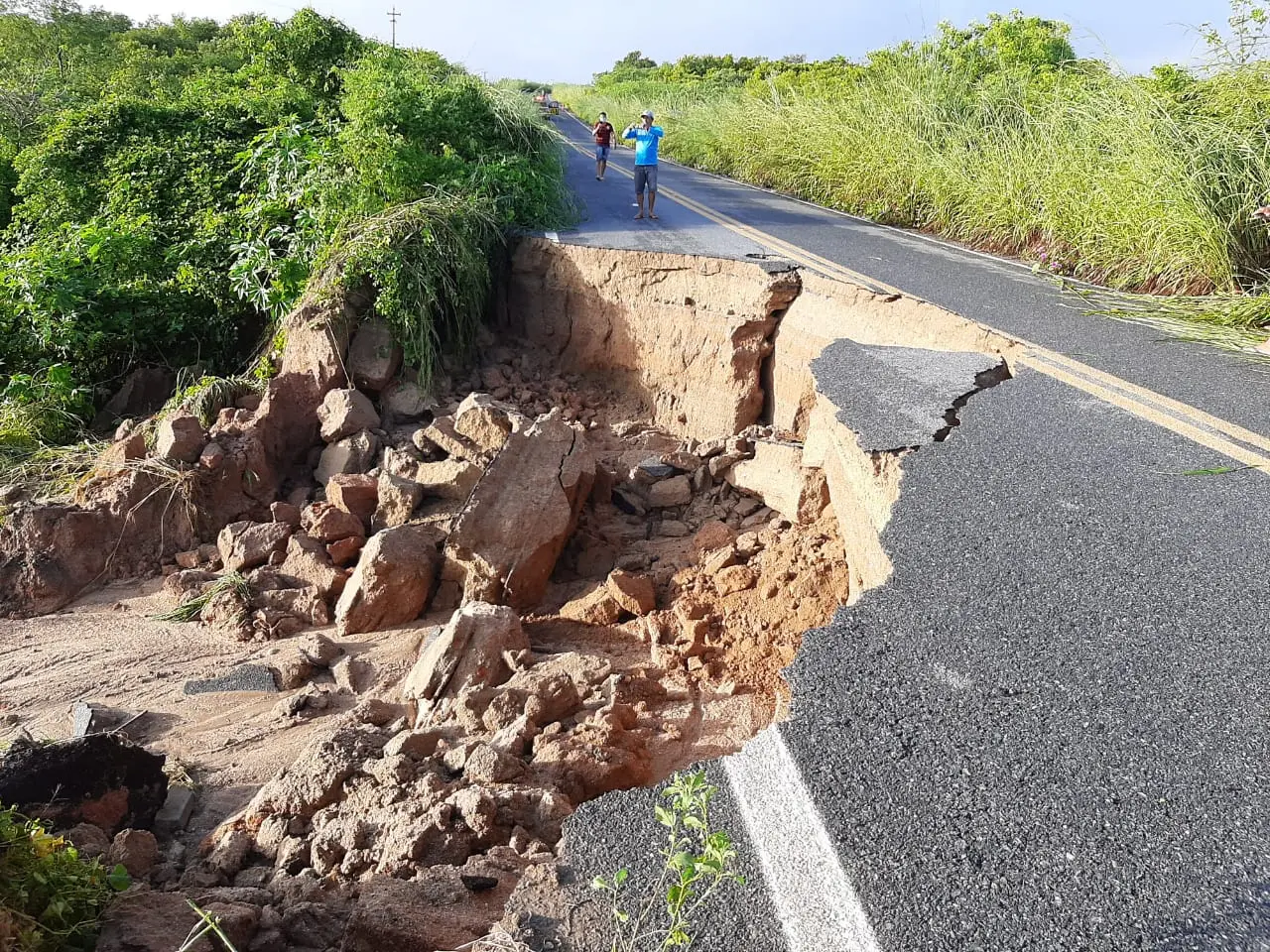 O asfalto da rodovia CE 183 cedeu após o rompimento de uma barragem na noite desta quarta-feira (22). A pista foi interditada entre os municípios de Varjota e Cariré, na região Norte do Ceará.