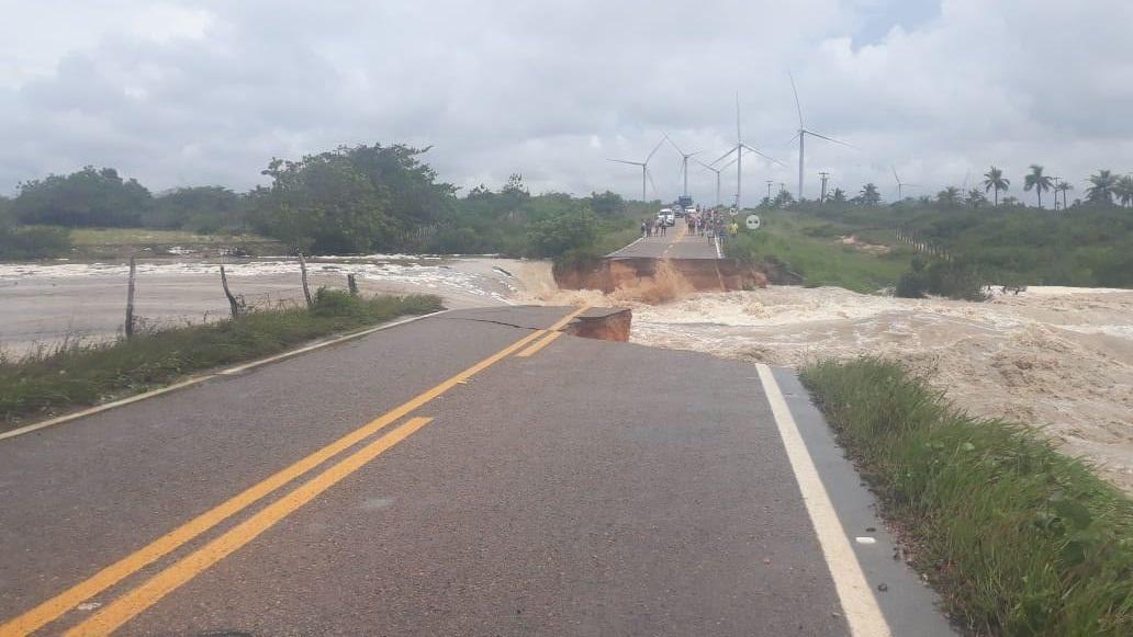 Rodovia CE-163: Crateras se abriram na rodovia CE-163, estrada de acesso a Mundaú, no dia 24 de março. A via ficou parcialmente destruída e precisou passar por reparos. No entanto, a estrada voltou a ceder durante obras de reparo, nesta quinta-feira (28).