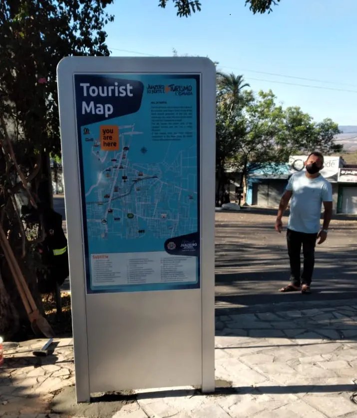 Equipamento serve de sinalização para turistas que visitam a terra do Padre Cícero. As informações estão nos idiomas português e inglês