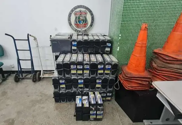 Quatro baterias de lítio e 109 estacionárias foram apreendidas, na segunda-feira (27), pela Polícia Civil no bairro Vicente Pinzón, em Fortaleza. Segundo as investigações, um funcionário de uma empresa de telefonia e internet seria o responsável pelo furto dos equipamentos.