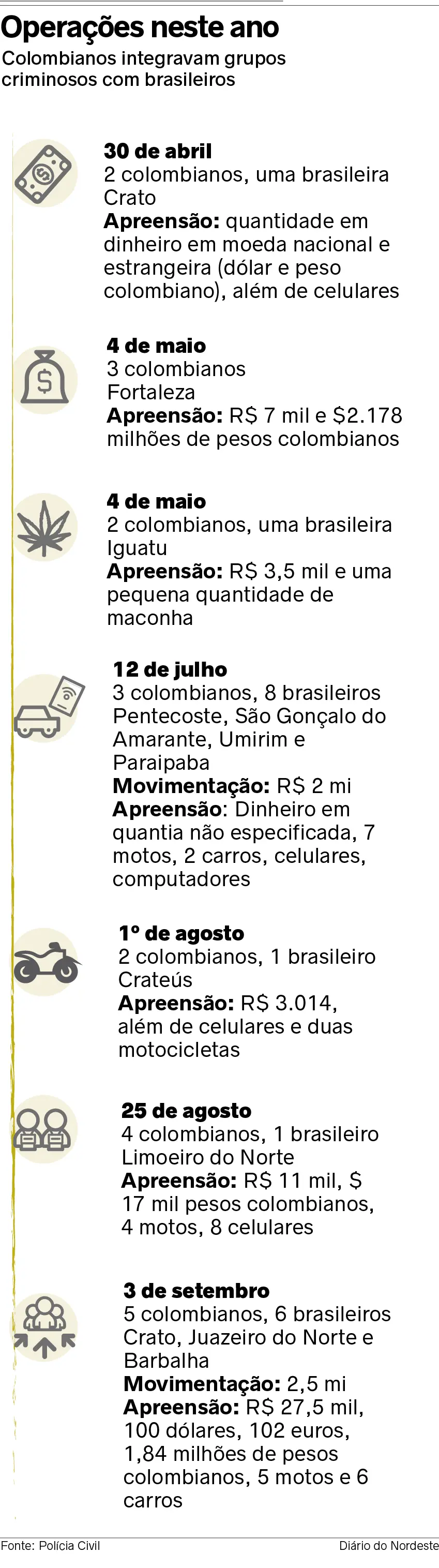 Somente na operação realizada ontem, no Cariri, a Polícia Civil registrou o repasse de R$ 2,5 milhões enviados de Juazeiro do Norte à Colômbia. Brasileiros também integram os grupos que vêm se formando no Estado
