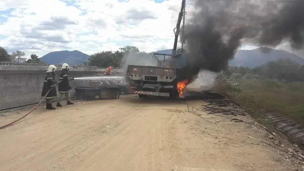 Um caminhão usado na obra rompeu a fiação elétrica e foi atingido por uma descarga de energia