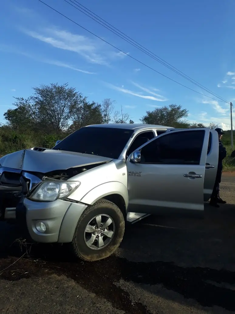 O veículo, modelo Hilux, estava com para-choque e capô amassados