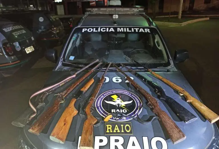De acordo com a PM, um revólver foi encontrado dentro do imóvel. Ainda durante as buscas, sete espingardas municiadas, todas do tipo socadeira, que estavam escondidas embaixo de uma cama, também foram localizadas pelos policiais.