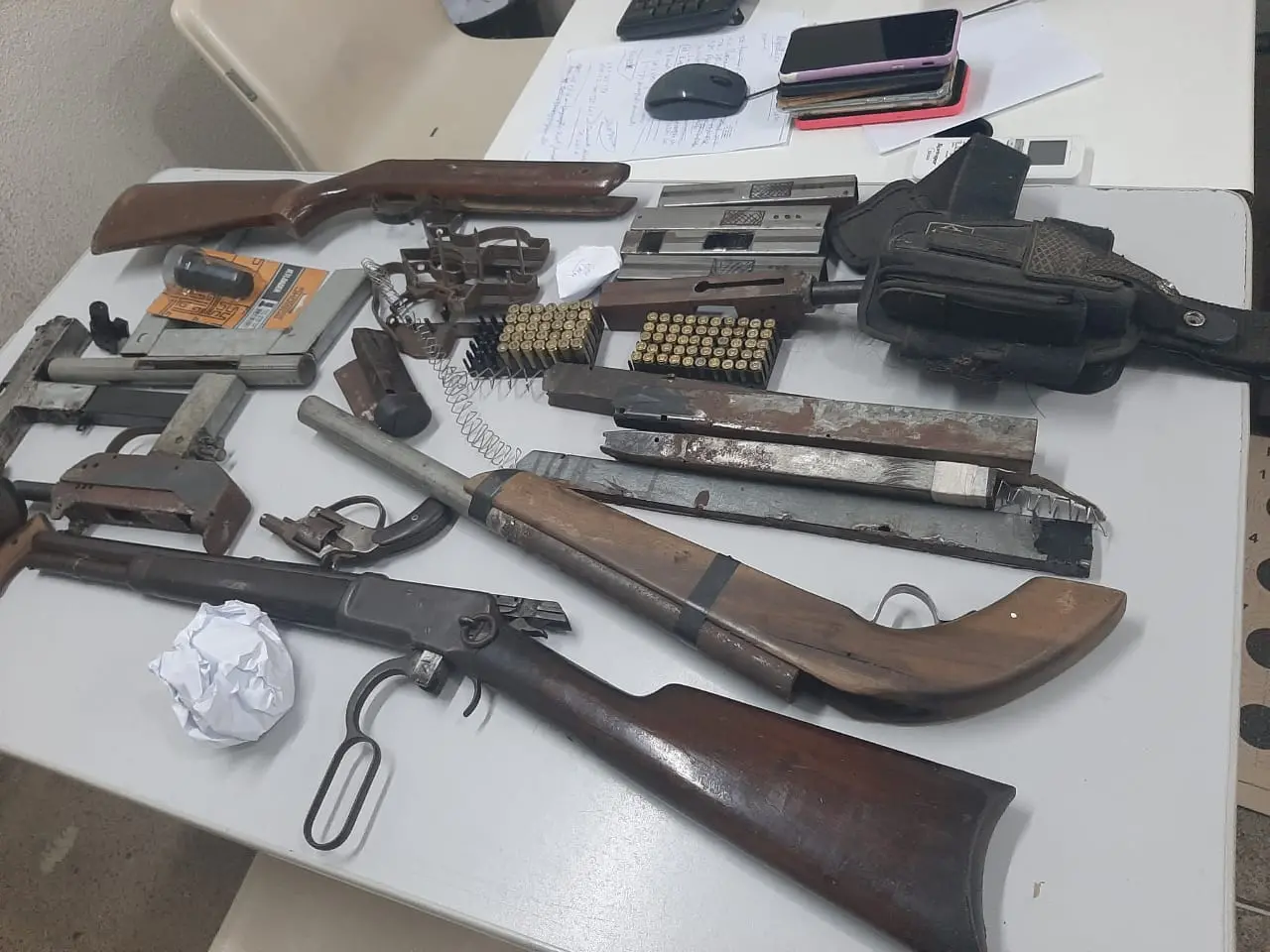 Um rifle, um revólver, três submetralhadoras, uma espingarda artesanal e 197 munições foram apreendidas pela polícia