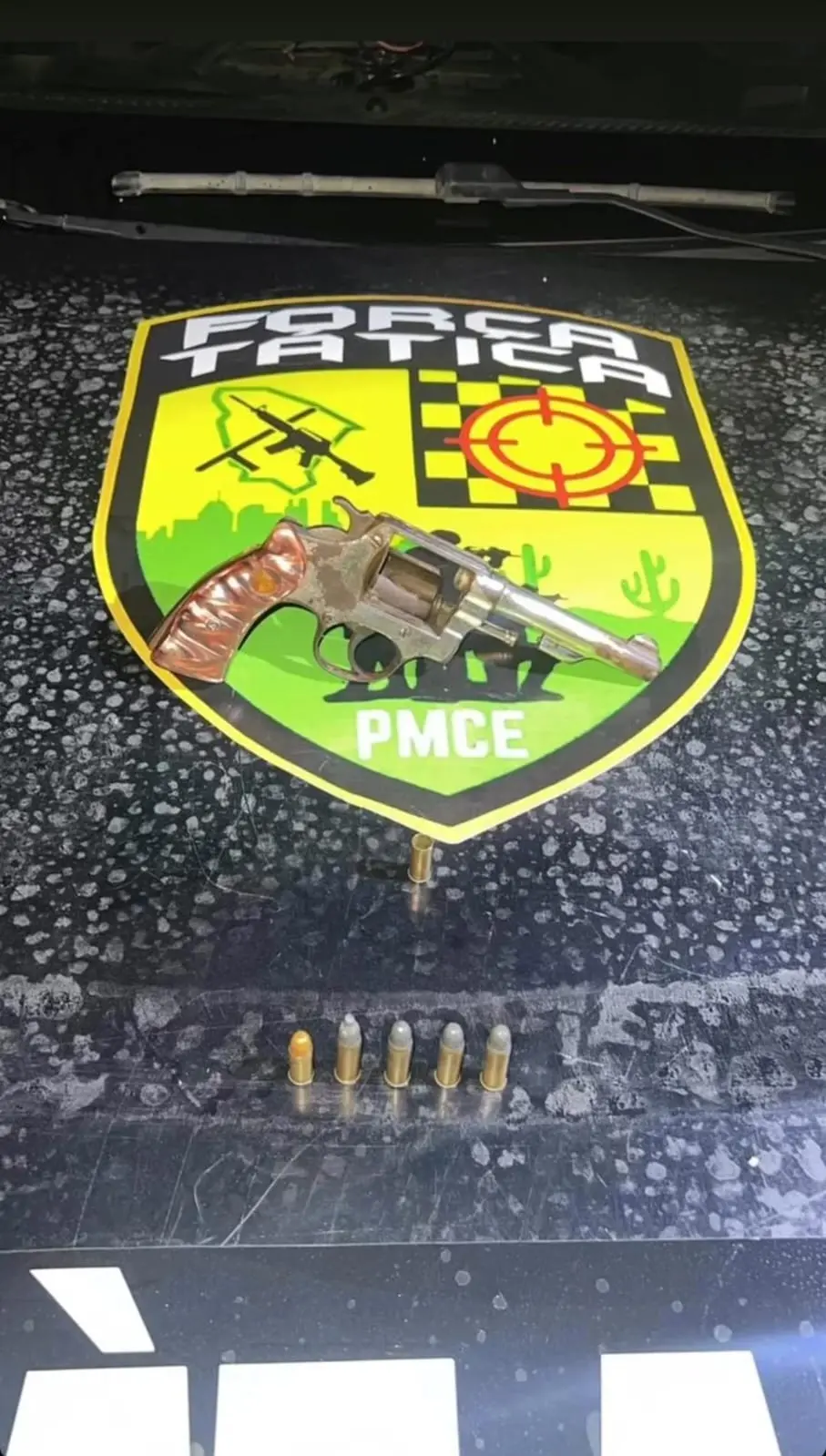 Na tentativa de fuga, um revólver calibre 32 foi abandonado e localizado por uma composição da Força Tática. Já a motocicleta usada pela dupla tinha sinais de adulteração e registro de roubo.