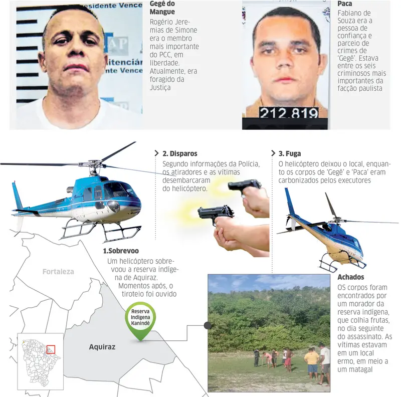 Dois corpos foram achados em uma reserva indígena de Aquiraz. Parecia apenas mais um registro nos números assombrosos da violência no Ceará, mas o caso se revelou uma verdadeira história de cinema. As vítimas eram dois líderes da alta cúpula da facção criminosa paulista Primeiro Comando da Capital (PCC), que estavam foragidos da Justiça. Rogério Jeremias de Simone, o ‘Gegê do Mangue’; e Fabiano Alves de Souza, o ‘Paca’, foram assassinados em uma área de acesso remoto, na Região Metropolitana de Fortaleza, com o uso de um helicóptero no atentado. Mas, afinal, o que ‘Gegê’ e ‘Paca’ faziam no Ceará?