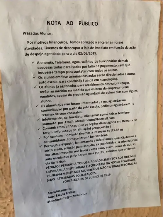 Na manhã da última quinta-feira, os alunos encontraram apenas uma nota de esclarecimento na entrada da Autoescola Freitas informando que a instituição foi fechada devido motivos financeiros. Um email para contato foi disponilizado, mas as vítimas afirmaram que ainda não obtiveram nenhuma resposta.