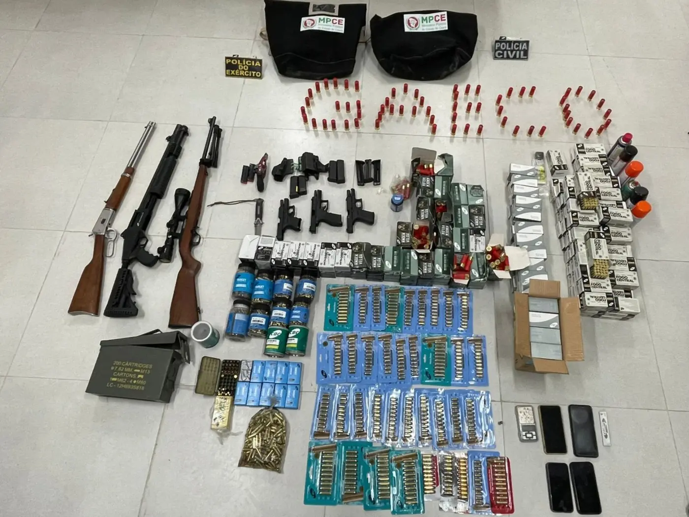 Um mandado de busca e apreensão foi cumprido contra o suspeito, na residência onde ele mora, em um condomínio no Icaraí, em Caucaia, Região Metropolitana de Fortaleza (RMF). No imóvel, foram apreendidas sete armas de fogo (três rifles, três pistolas e um revólver), centenas de munições e dois aparelhos celulares.