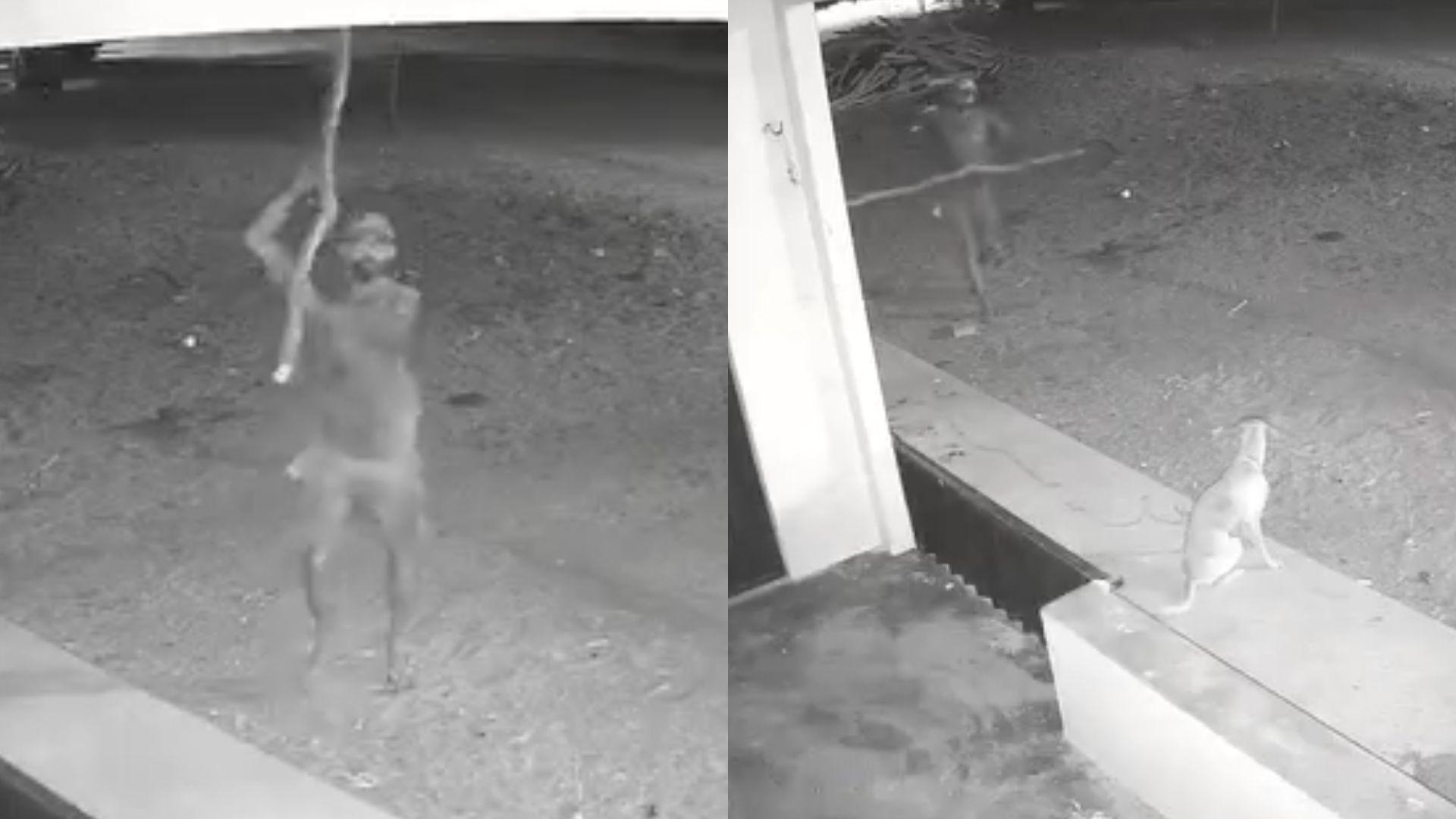 O agressor passa pelo cachorro, que não esboça reação, pega uma estaca e volta para o animal. Ele levanta o objeto e assusta o cão.