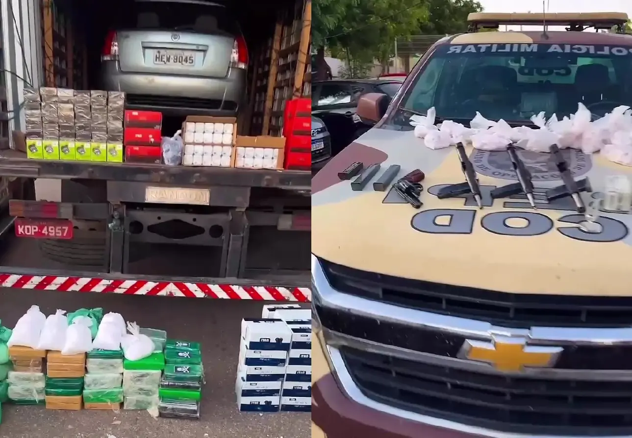 Um caminhão carregado de drogas e armas foi interceptado pela Polícia Militar do Ceará (PMCE), no município de Nova Russas, no Interior do Ceará, na última sexta-feira (25). 145 kg de drogas, quatro armas de fogo, 200 munições, um carro e seis motocicletas foram apreendidos.