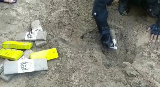 Eles entraram pelo quintal e encontraram uma motocicleta, um troféu de rinha e vários apetrechos para treinar os galos de briga. Durante buscas pelo terreno, os militares encontraram os entorpecentes enterrados.