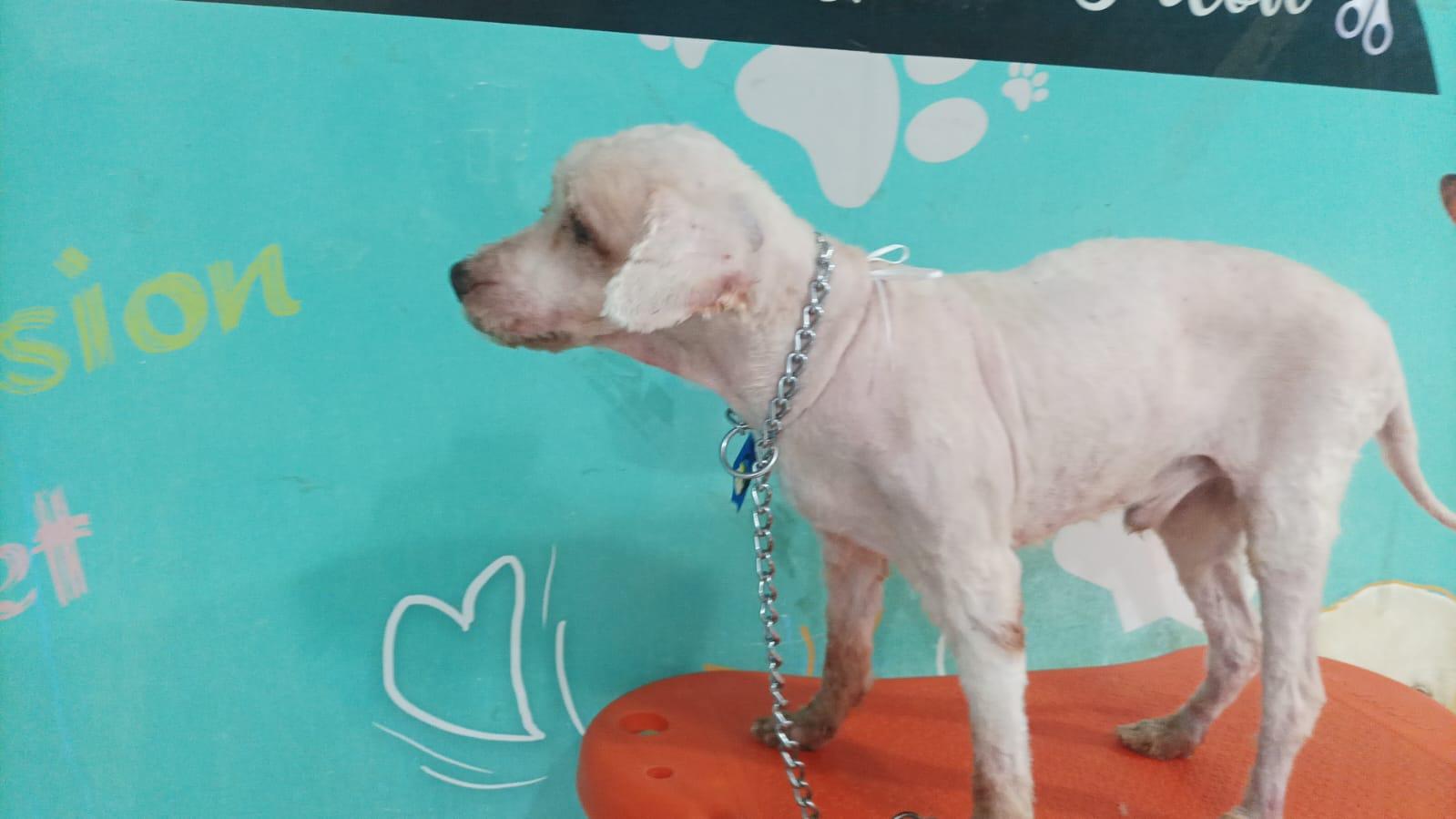 Quando foi resgatado, Scooby, de 14 anos, foi levado para a ONG Anjos da Proteção Animal (APA). Ele estava com acúmulo de pelo, nunca havia sido vermifugado e apresentava problemas de visão e inflamação de pele.