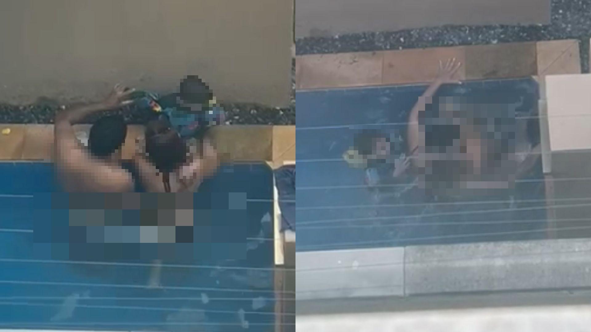 Nas imagens, um homem e uma mulher estão dentro de uma piscina em ato sexual enquanto a criança, que tem entre 2 e 3 anos, nada perto deles.