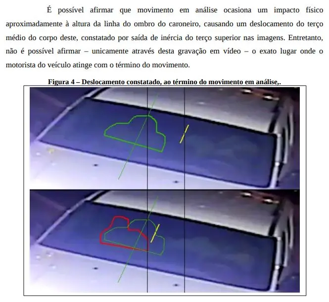 O perito ressalta "que não é possível afirmar – unicamente através da análise desta gravação em vídeo – o exato ponto onde o motorista do veículo atinge com o término deste movimento". A análise foi dificultada pela qualidade técnica do vídeo e devido ao fumê do carro, mas chegou à essa conclusão com o auxílio de diversos programas de computação.
