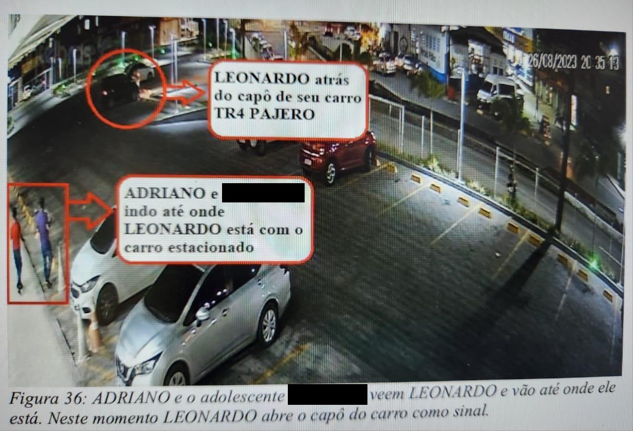 Os investigadores solicitaram imagens das câmeras de segurança do shopping e visualizaram uma cena que ligou os três suspeitos: Leonardo esperava no seu carro (que foi identificado pela placa) por Adriano e pelo adolescente para conversarem por cerca de 10 minutos, entre 20h35 e 20h44 da noite de 26 de agosto deste ano. Ao serem reinquiridos após o levantamento das imagens, Adriano e o adolescente contaram detalhes do feminicídio planejado por Leonardo.