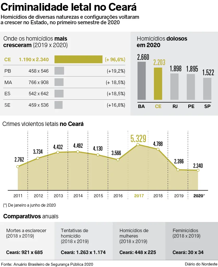 É como se todos os passageiros de seis ônibus comuns lotados morressem em um acidente, todo mês, no Ceará. Todos. Essa é a média mensal de pessoas assassinadas no Estado, no primeiro semestre deste ano, segundo o Anuário Brasileiro de Segurança Pública 2020, divulgado ontem (19). Entre janeiro e junho, foram contabilizadas 2.340 mortes violentas intencionais (MVIs) em território cearense, quase o dobro (96,6%) do registrado em igual período de 2019, que teve 1.190 registros; e o 3º maior número do Brasil no período.