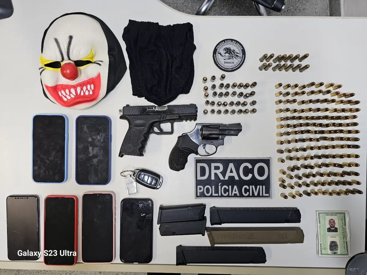 Com o suspeito, foram apreendidas duas armas de fogo (um revólver e uma pistola), cinco carregadores, 202 munições de calibres diversos, seis aparelhos celulares, um colete balístico, uma máscara, uma balaclava e um carro de luxo.