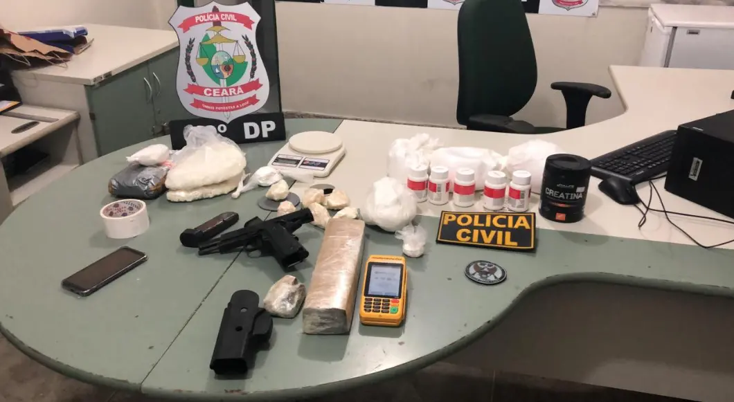 Um dos chefes de uma facção criminosa de Fortaleza foi preso, no fim da tarde desta quinta-feira (5), no Bairro Pedras, em Fortaleza. De acordo com a Secretaria de Segurança Pública (SSPDS), ele fabricava droga e foi encontrado com quase 2,5 quilos de entorpecentes, além de material para o preparo das substâncias e uma máquina de cartão de crédito.