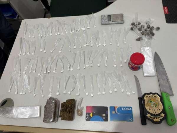 "Foi encontrada uma bolsa aberta com tabletes e trouxinhas de maconha em cima do sofá, como também cocaína, crack, uma balança de precisão, material para embalar drogas e um caderno de anotações na casa. Ainda durante buscas pela área, a equipe da Polícia Civil recebeu informações de que um indivíduo tentava atravessar a nado o Rio Ceará. O suspeito, entretanto, desistiu e foi capturado pela equipe do 23º Distrito Policial (23º DP)", informou a SSPDS.