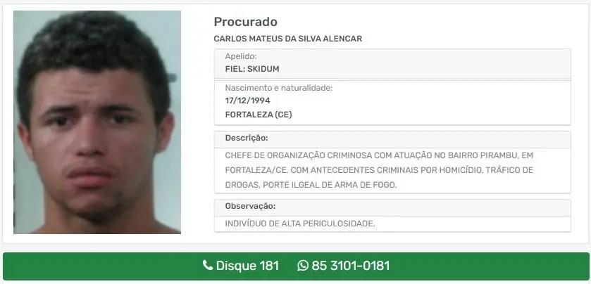 Carlos Mateus da Silva Alencar, o 'Skidum' ou 'Fiel', consta na Lista dos Mais Procurados da SSPDS, onde é descrito como "chefe de organização criminosa com atuação no bairro Pirambu, em Fortaleza/CE, com antecedentes criminais por homicídio, tráfico de drogas, porte ilegal de arma de fogo" e "indivíduo de alta periculosidade".