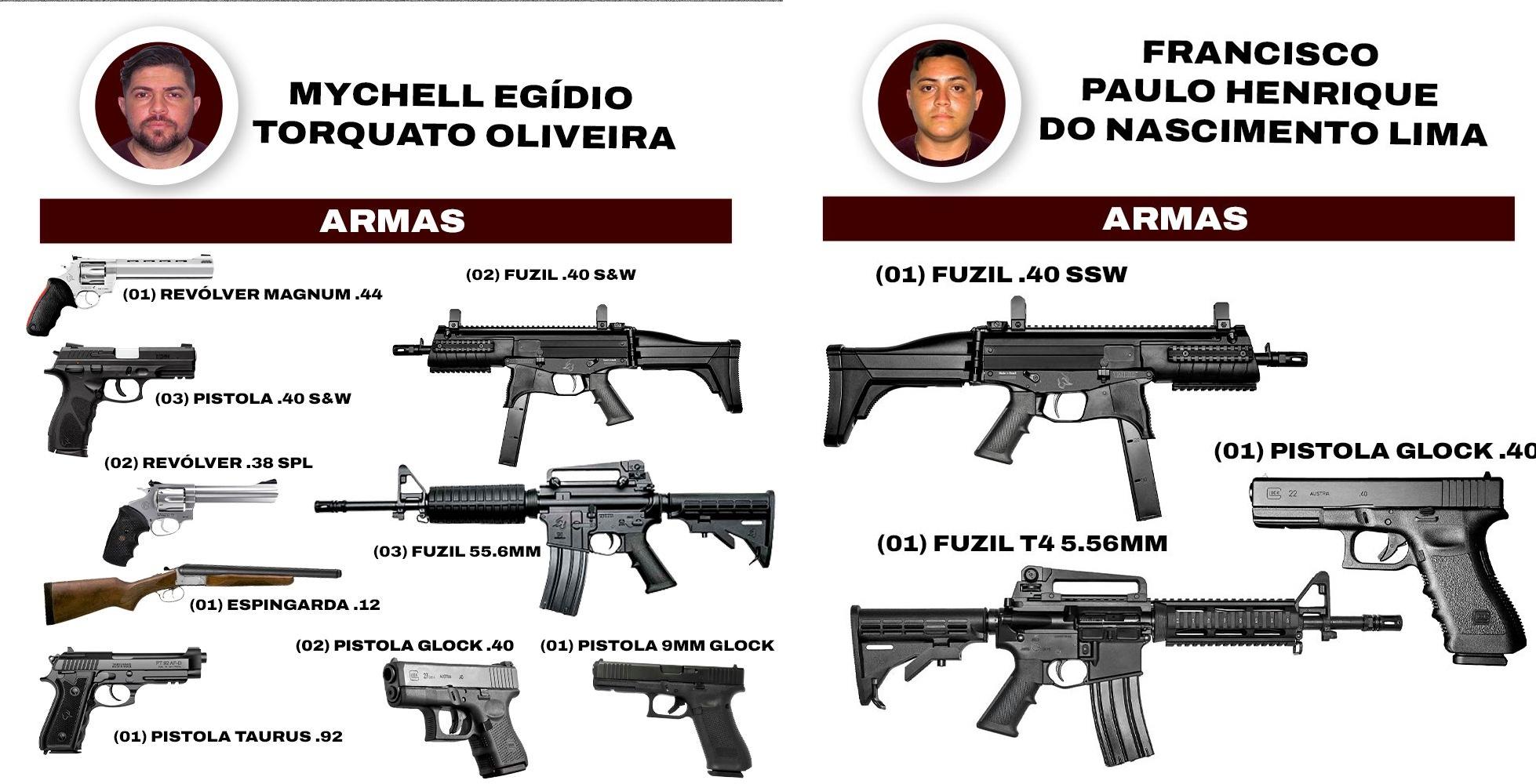 Os suspeitos possuíam um verdadeiro arsenal. A reportagem apurou que as investigações policiais identificaram que o comerciante Mychell Egídio Torquato Oliveira e o comparsa dele, Francisco Paulo Henrique do Nascimento Lima, detinham o poder de pelo menos 19 armas de fogo, avaliadas em mais de R$ 220 mil. Entre elas, sete fuzis, além de espingarda, pistolas e revólveres.
