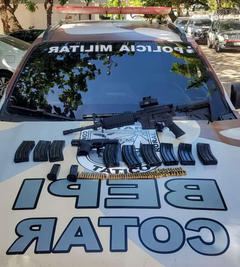 Com a dupla, foi apreendida uma pistola calibre Ponto 40, com três carregadores. Na sequência da ação, os policiais militares apreenderam um fuzil, que estava em um imóvel, no bairro Messejana, em Fortaleza.