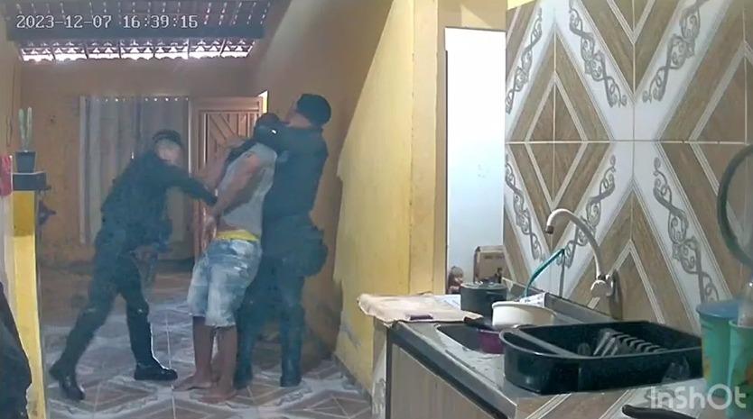Enquanto outros PMs realizam buscas em uma casa, um policial militar pergunta ao suspeito se ele "tá pensando que tem menino aqui?" e o agride com um tapa. "Tu tá pensando que a gente vai dar viagem perdida aqui? Tá pensando que nós estamos brincando aqui?", questiona o militar, com mais dois tapas no rosto do suspeito.