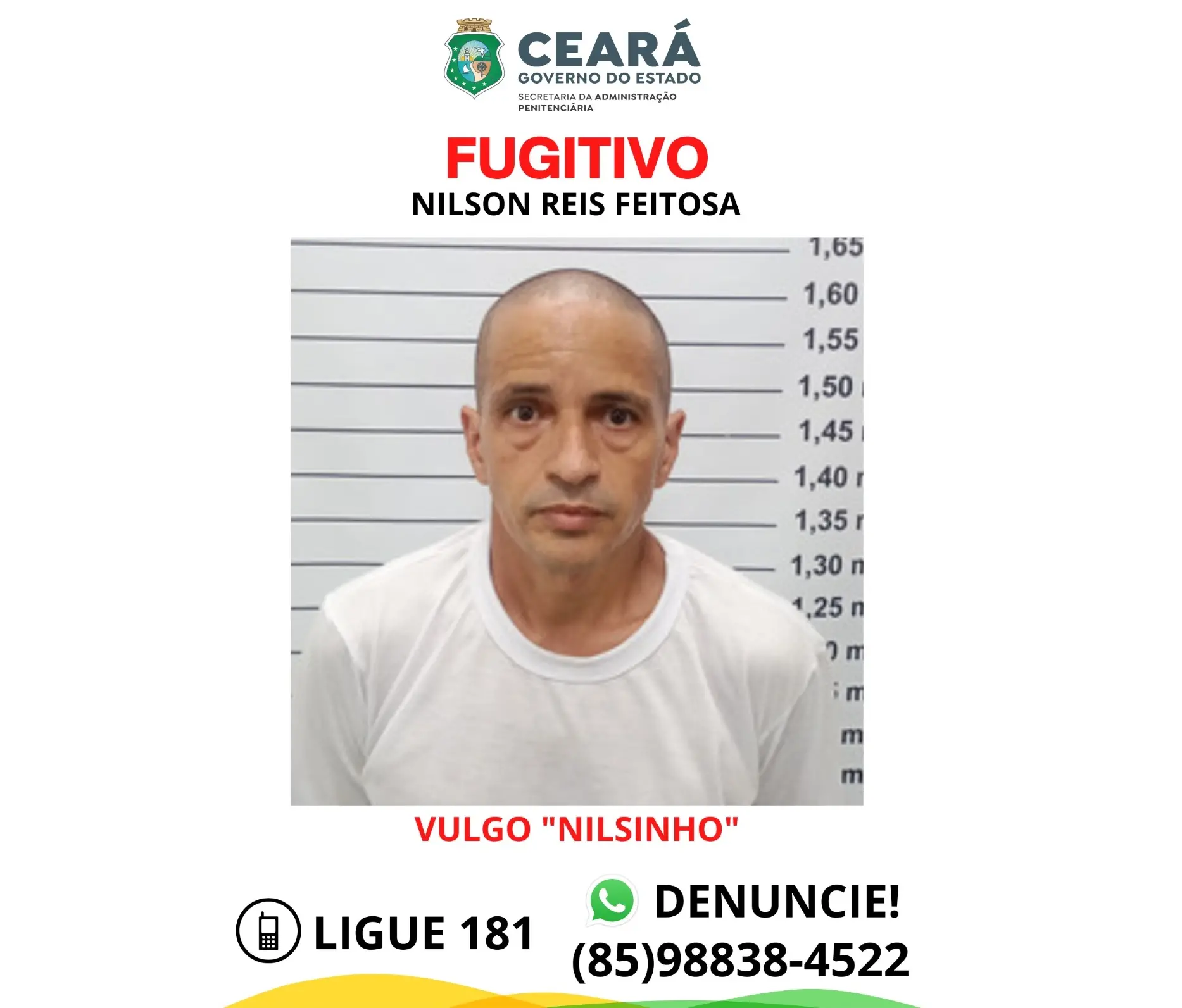 Nilson Reis Feitosa, conhecido como 'Nilsinho', já respondeu no Ceará a processos criminais por lesão corporal e roubo. Informações sobre a sua localização podem ser repassadas para a Polícia através dos números 181 ou (85) 98838-4522.