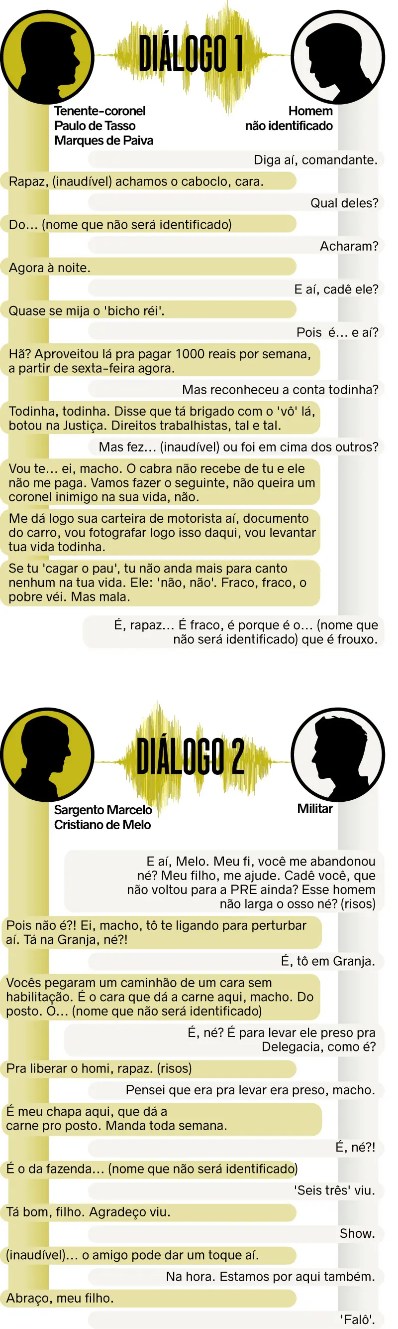 Em uma das conversas interceptadas por decisão judicial, o tenente-coronel Paulo de Tasso Marques de Paiva, comandante do BPMA na Região, revela a um homem não identificado, no dia 28 de janeiro último, que pressionou outro homem para pagá-lo R$ 1 mil semanal, com ameaças. Eles riem da situação e, na sequência, combinam de irem cobrar de outra pessoa nos próximos dias.