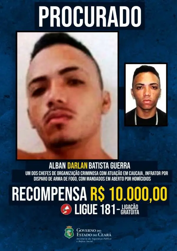 No mês passado, o Diário Oficial do Estado do Ceará (DOE-CE) publicou a decisão sobre a Lei da Recompensa, que resolveu oferecer R$ 10 mil para que possa fornecer informações sobre ‘Darlan’, em relação ao seu paradeiro.