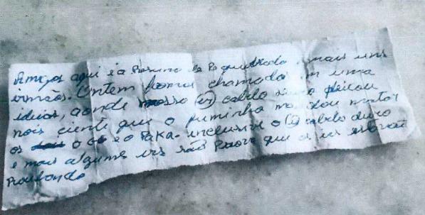 "Amigos aqui é o resumo do Pé Quebrado e mais uns irmãos. Ontem fomos chamados em uma ideias, aonde nosso ir (irmão) Cabelo Duro deixou nois ciente que o Fuminho mandou matar os dois o GG e o Paka. Inclusive o ir (irmão) Cabelo Duro e mais alguns irs (irmãos) são prova deque os irs (irmãos) estavão roubando", aponta o bilhete.