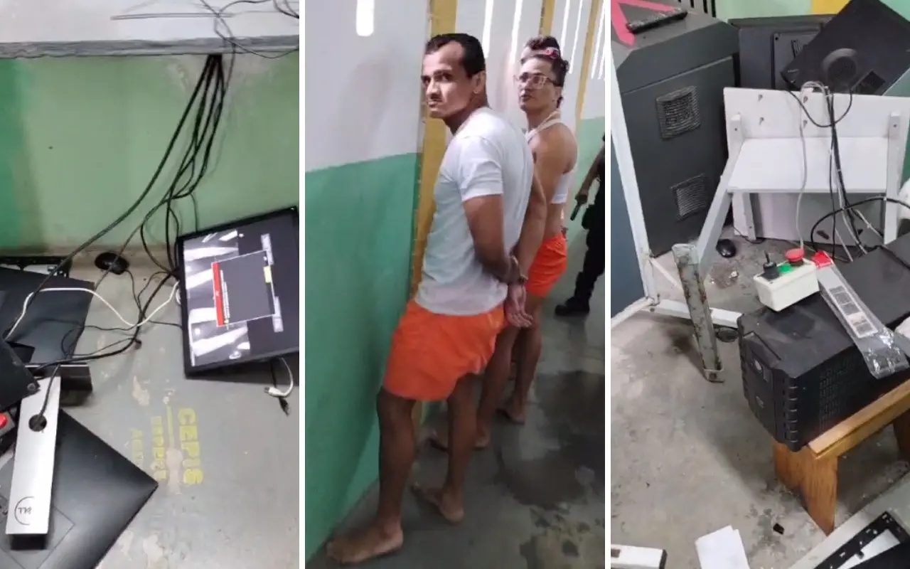 Em vídeo registrado na unidade prisional, é possível ver pelo menos três computadores destruídos no chão.