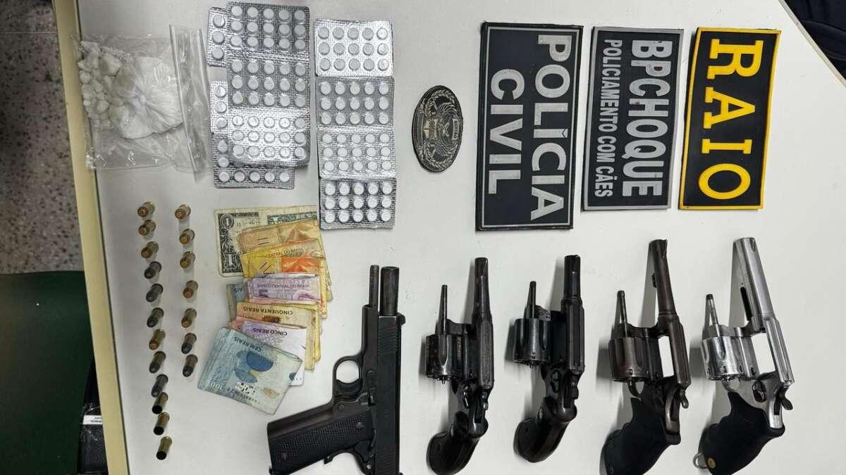 Durante as diligências, os policiais também apreenderam quatro revólveres, uma pistola calibre 40, munições e uma quantia em dinheiro. Seis aparelhos celulares, uma motocicleta roubada e cinco gramas de cocaína também foram apreendidos.
