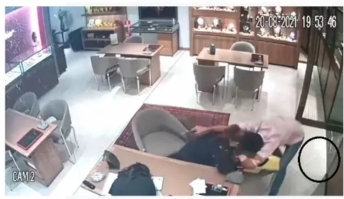 A vítima vestia uma blusa e um casaco quando foi alvejada. As câmeras de segurança da joalheria mostram a troca de tiros entre o segurança e um dos assaltantes. O homem, armado com um revólver, puxa a gerente para perto dele, utilizando o corpo da vítima como escudo na tentativa de se proteger dos tiros efetuados pelo segurança enquanto sai da loja. Neste momento, mais tiros são efetuados e a mulher cai de joelhos.