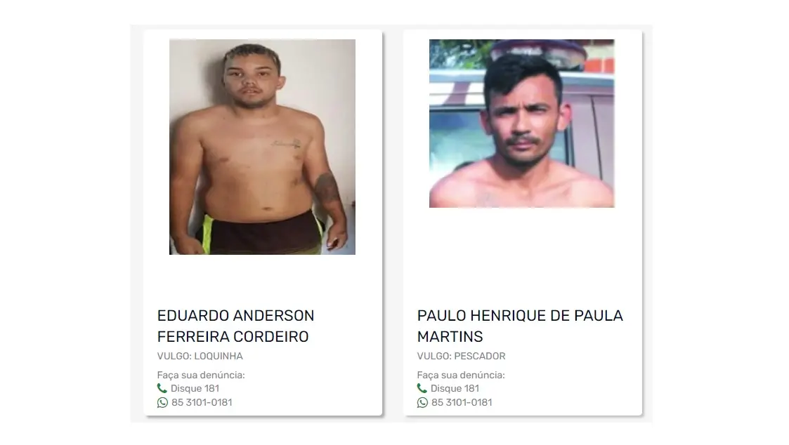A SSPDS ressalta, em seu site, que Eduardo Anderson Ferreira Cordeiro, conhecido como 'Loquinha', de 23 anos, e Paulo Henrique de Paula Martins, o 'Pescador', 33, são considerados "perigosos". Sobre 'Loquinha, a Pasta afirma que é um "homicida com forte atuação na Região Norte do Estado do Ceará, principalmente nos municípios de Sobral e Forquilha, além de responder por porte ilegal de arma de fogo".
