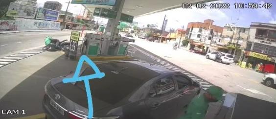 O caso foi gravado pelas câmeras de segurança do estabelecimento. As imagens mostram quando, às 10h59, o homem de moto para ao lado de uma bomba de gasolina para abastecer. Logo que faz o movimento de sair do local sem pagar, o frentista tenta conter o homem.