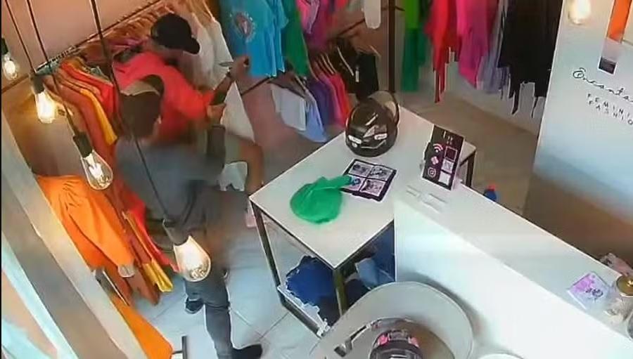 Laisa do Nascimento Andrade, de 26 anos, é a dona de uma loja de roupas, no bairro São Miguel, em Juazeiro do Norte. Ela foi abordada por dois homens que chegaram fingindo ser clientes. O crime foi registrado por câmeras de segurança.