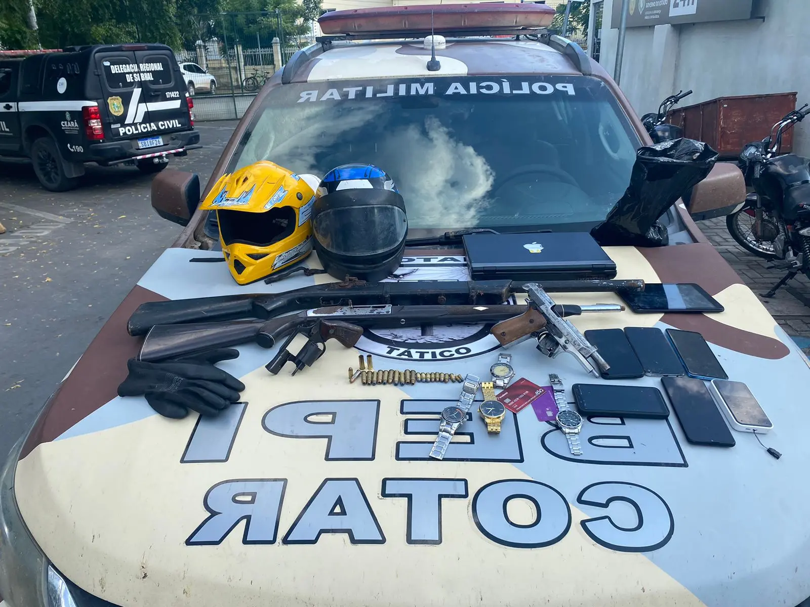 Ainda conforme a corporação, foram apreendidos na ocorrência pistola calibre 765, um revólver calibre .38, uma espingarda artesanal calibre .12, um rifle de calibre .22, 13 munições intactas e duas deflagradas de calibre .38, nove munições de calibre 765, três munições intactas de calibre .22, maconha (16 gramas), cocaína (sete gramas), crack (16 pedrinhas), relógios, tablet, maquineta de cartão, cinco smartphones, notebook, caderno com anotações, duas luvas, sacos para embalagem de drogas, placa de motocicleta e dois capacetes.