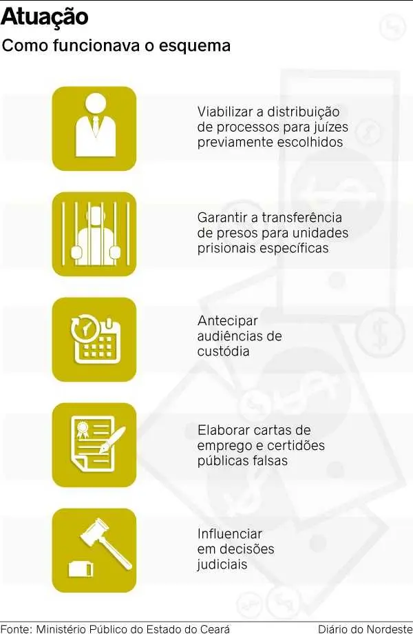 A Vara de Delitos de Organizações Criminosas expediu 15 mandados de prisão (sendo oito preventivas e sete temporárias) e 25 mandados de busca e apreensão. Eles foram cumpridos em residências e escritórios de advocacia, em Fortaleza, Caucaia e Maracanaú. Os investigados são acusados de organização criminosa, corrupção ativa e passiva, concussão, tráfico de influência, exploração de prestígio e estelionato, conforme a participação individual.