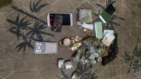 Em posse da dupla, os policiais militares encontraram 700 g de maconha, 17 g de cocaína, um revólver calibre 38, seis munições do mesmo calibre, duas facas, duas balanças de precisão, cinco relógios, dois aparelhos celulares, uma motocicleta e uma certa quantidade de dinheiro trocado.
