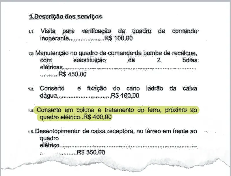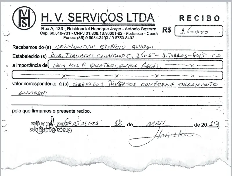Ao todo, a H. V. Serviços recebeu R$ 1,4 mil pelas atividades no condomínio, que ainda incluíam visita para verificação do quadro de comando; manutenção deste e da bomba de recalque com substituição de duas boias elétricas; conserto e fixação do cano ladrão da caixa d'água; e desentupimento de caixa receptora. O Diário do Nordeste tentou contatar o dono da empresa, mas não obteve resposta até o fechamento desta edição