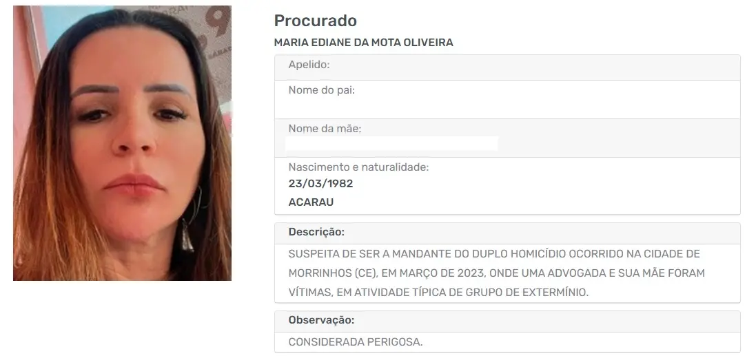 A SSPDS detalha, em seu site, que Maria Ediane é "suspeita de ser a mandante do duplo homicídio ocorrido na cidade de Morrinhos (CE), em março de 2023, onde uma advogada e sua mãe foram vítimas, em atividade típica de grupo de extermínio" e ressalta que a mulher foragida é "considerada perigosa".