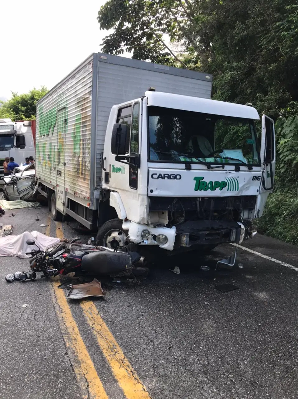 A colisão ocorreu depois de um caminhão sem freio colidir na traseira de uma fila de veículos que desciam a Serra. Por conta do impacto, um outro caminhão, que estava na frente da fila, avançou a contramão e colidiu frontalmente com uma motocicleta e um carro.
