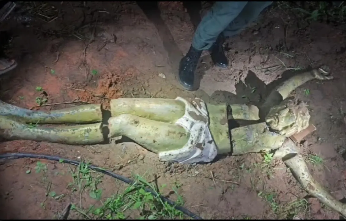 No quintal do imóvel, a equipe notou uma área de terra recentemente remexida. Ao escavar o local, encontraram os pedaços da escultura, que havia sido quebrada, possivelmente para facilitar o transporte.
