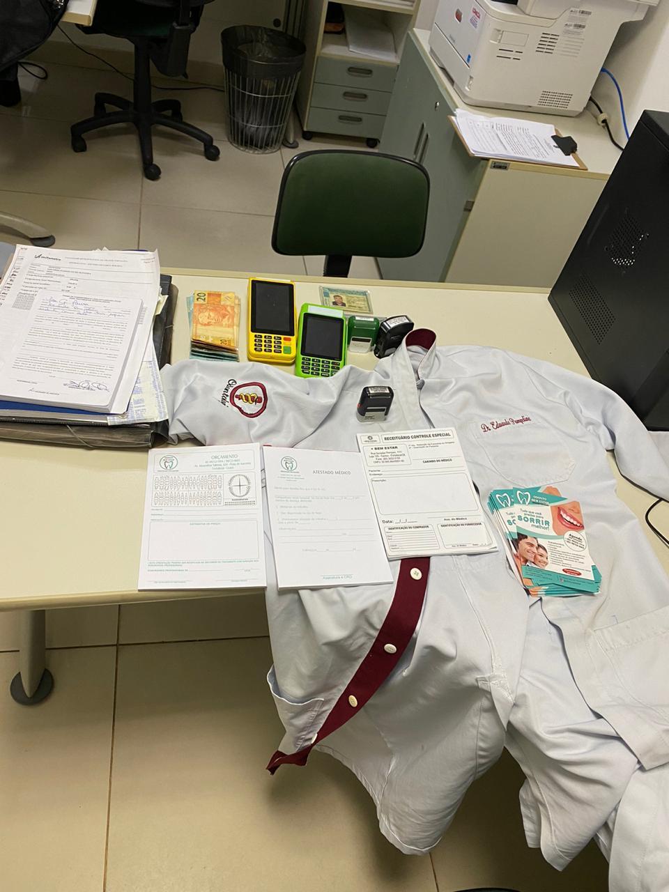 Os policiais apreenderam na clínica um jaleco, carimbos com o nome de suspeito acompanhado da denominação de cirurgião-dentista, receituários médicos, dinheiro e máquinas de cartão de crédito. O casal foi autuado por falsificação de documento particular, falsidade ideológica e exercício ilegal da odontologia.