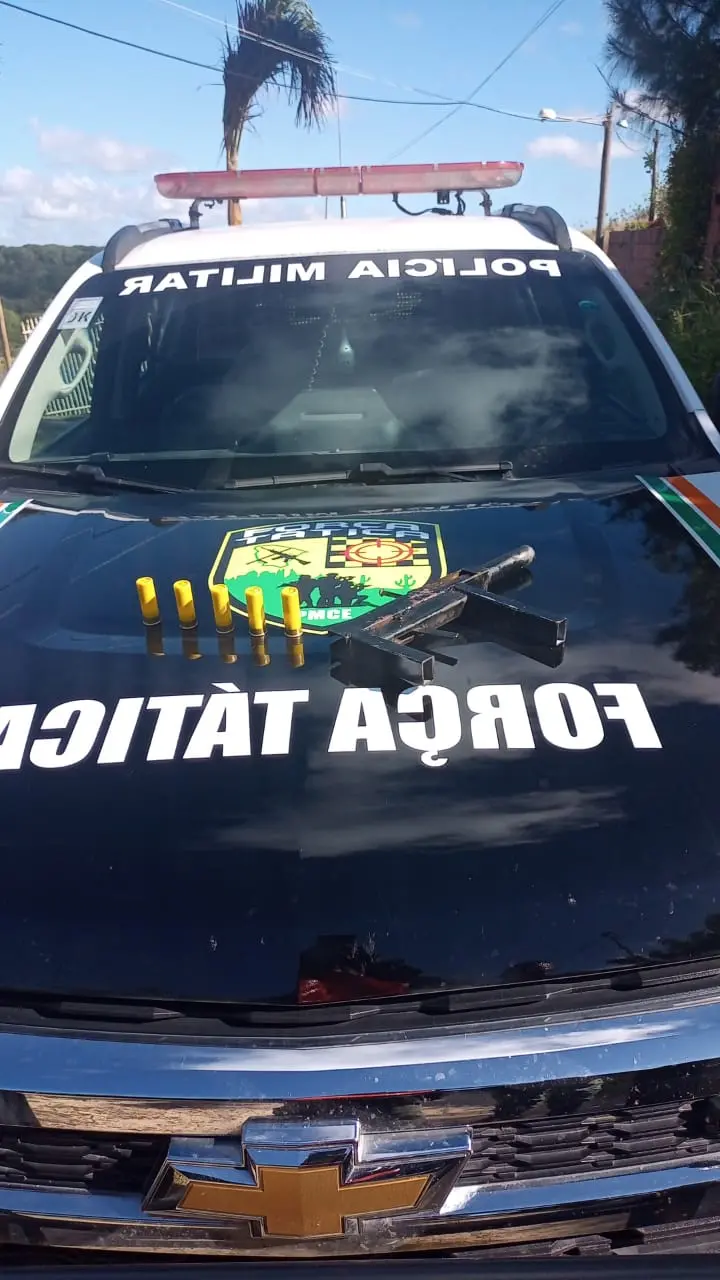 No local, foram apreendidos uma escopeta artesanal calibre 12 e 5 cartuchos do mesmo calibre. O suspeito já respondia a 3 homicídios, porte ilegal de arma de fogo de uso permitido e receptação.