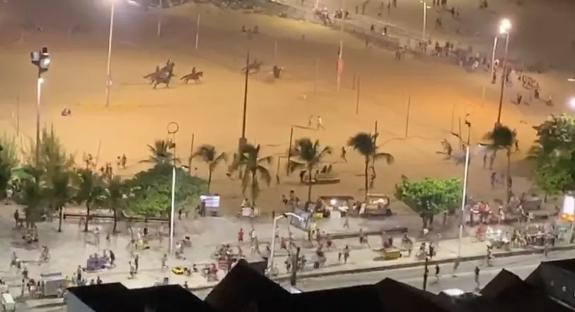 Um vídeo gravado por um morador de um prédio, mostra pessoas correndo tanto no calçadão quanto na faixa de areia, onde homens da cavalaria da polícia foram vistos fazendo a dispersão de uma aglomeração.